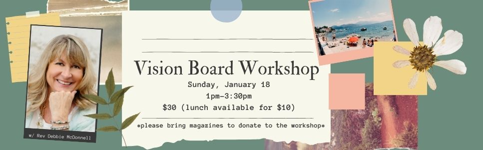 Set your intention for the New Year with a Vision Board. What do you want to call into your life this year? A Vision Board can be a powerful tool to help bring your dreams into reality. All you need to create a board will be provided. There will be a light lunch available for purchase before the workshop ($10)